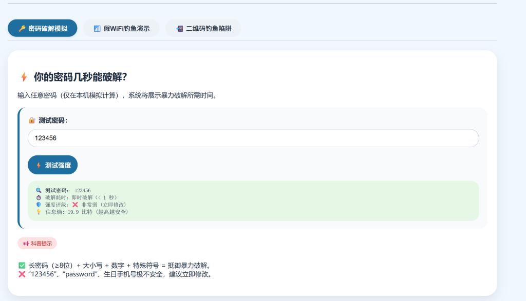 老师们现场指导学生运行密码破解模拟程序,让学生亲手输入不同类型的密码,观察系统实时显示的破解时长,例如“zhang123”这类字母加数字的简单组合仅需约3秒,包含大小写字母和数字的破解时长约3小时,而由大小写字母、数字和特殊符号组成的破解时长则需要上百年。