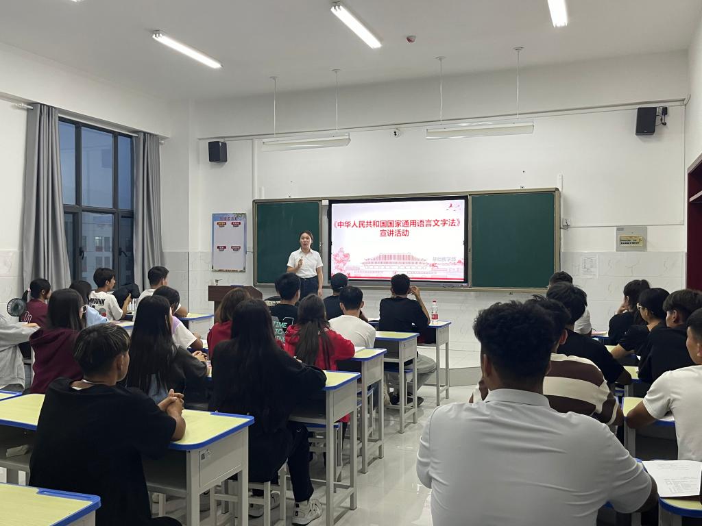 基础教学部教师根据学院安排,在各系各班进行《中华人民共和国国家通用语言文字法》宣讲。信息工程系的国家通用语言课课堂上,李玉洁老师通过多媒体设备,以图文并茂的方式向同学们解读了实施《中华人民共和国国家通用语言文字法》的目的、对象、原则和内容,引导同学们深入了解推广国家通用语言文字的重要作用和意义,提倡大家在日常生活中养成说普通话及书写规范汉字的习惯,为维护民族团结,铸牢中华民族共同体意识贡献力量。