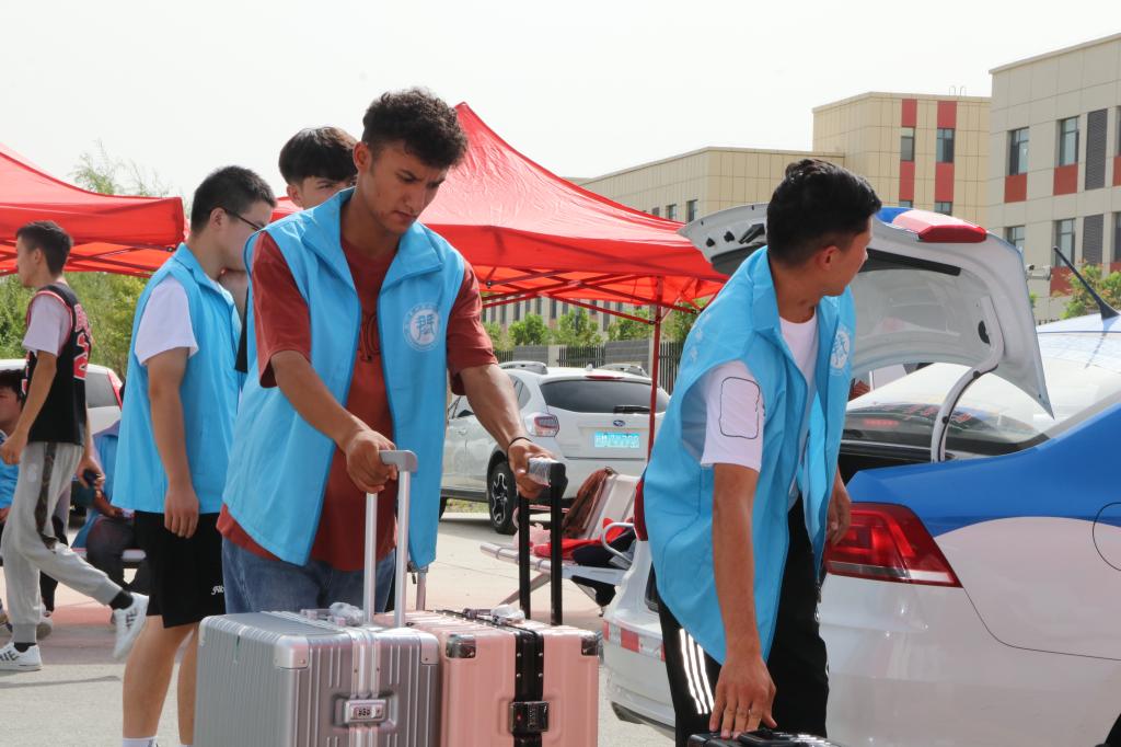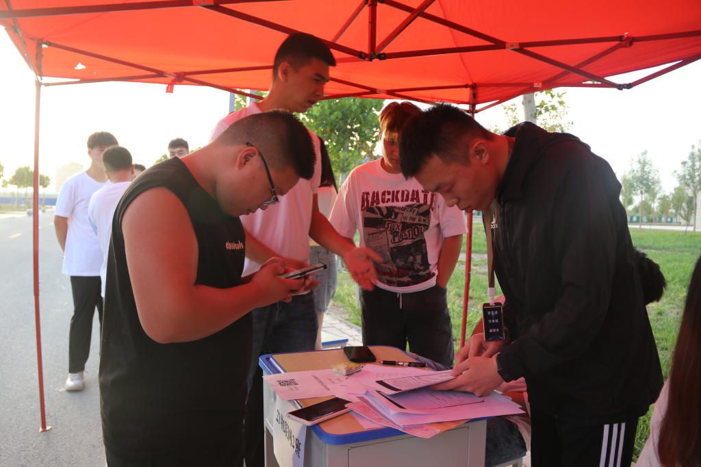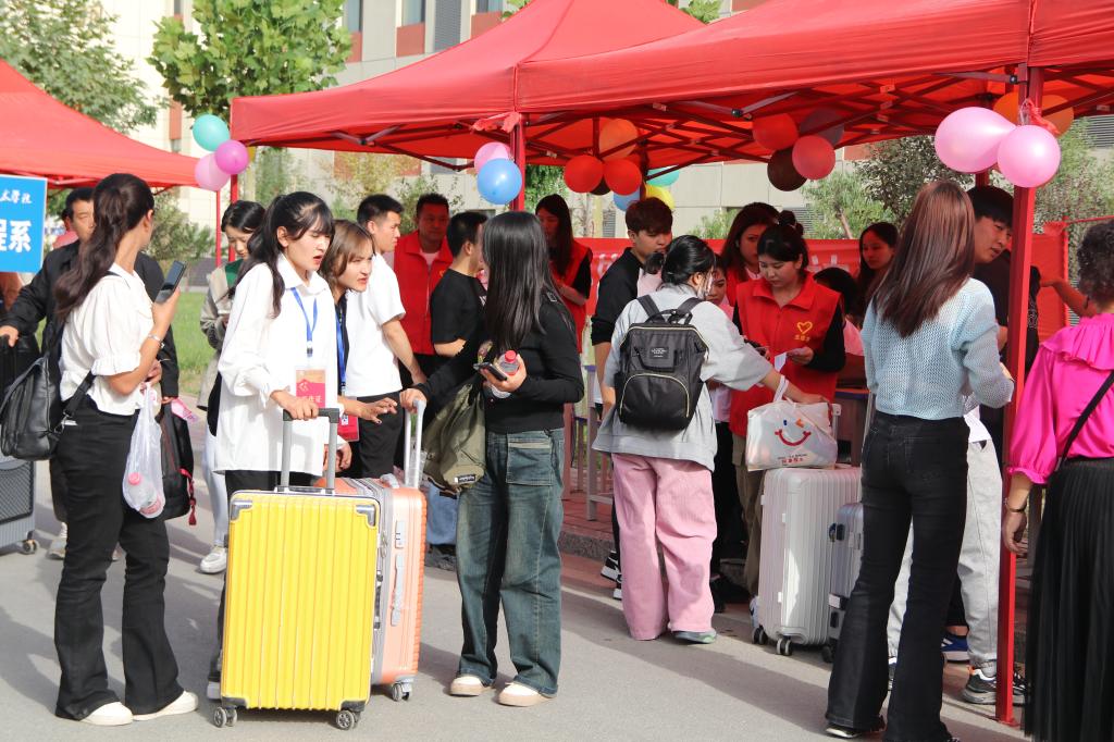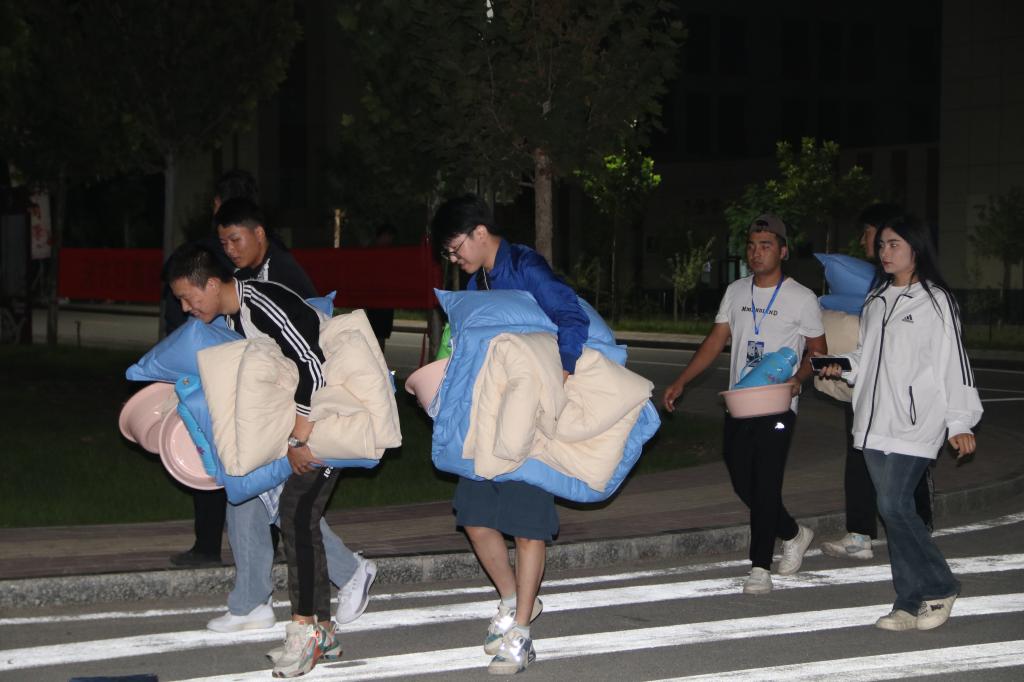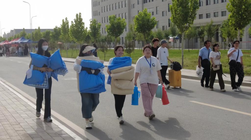宿舍楼前井然有序的队伍,是新生们在统一领取床上用品,在老师和学长学姐的帮助下,搬入新宿舍,这将是新生们未来几年学习生活的“家”。