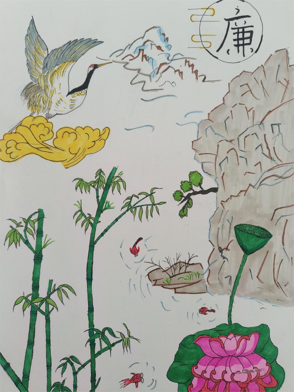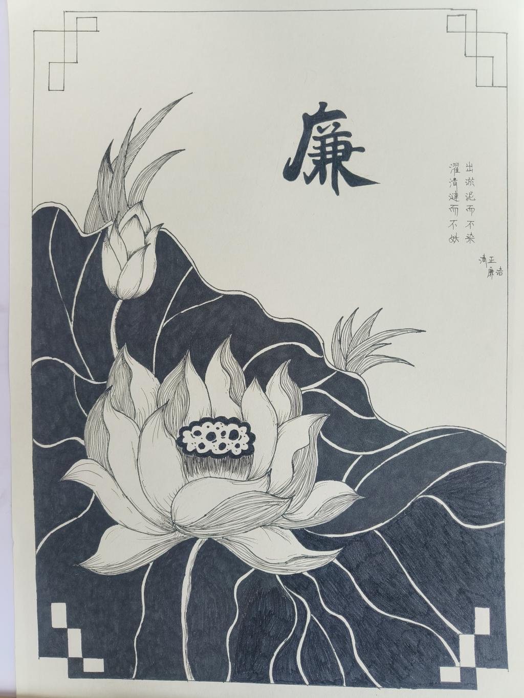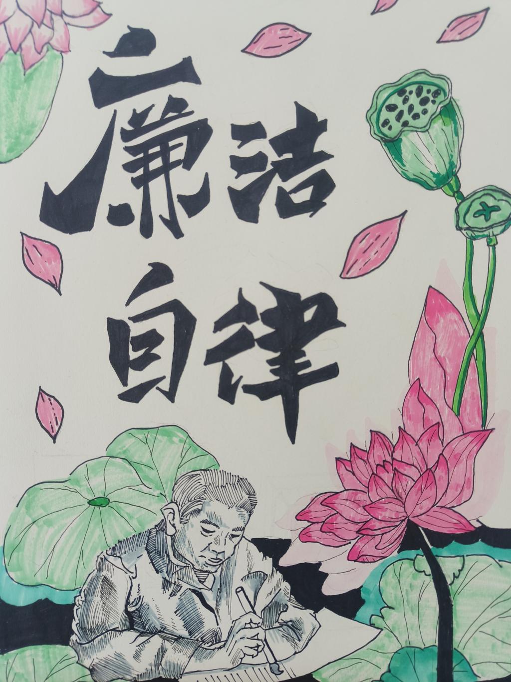 学生通过对主题的思考,创作了寓意“出淤泥而不染,濯清涟而不妖”的荷花、廉洁的“廉”字等丰富多样的作品;美术教研组教师积极指导,从构图设计、是否契合主题等方面筛选出一批优秀的作品进行展示,引来众多师生驻足观看。