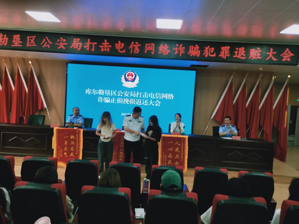 随后,学院代表、受害学生向库尔勒垦区公安局刑事侦查大队赠送锦旗。王保良书记向受害学生退还被诈骗钱款2万余元。