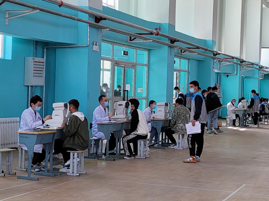当天上午,在学院的统一安排下,同学们井然有序地排队检测,医生们认真地给每个学生进行检查并做好记录。检查项目包括裸眼视力、眼球镜、瞳孔、散光、各类眼睛疾病等。当天共有1016名中职学生完成了视力项目筛查。