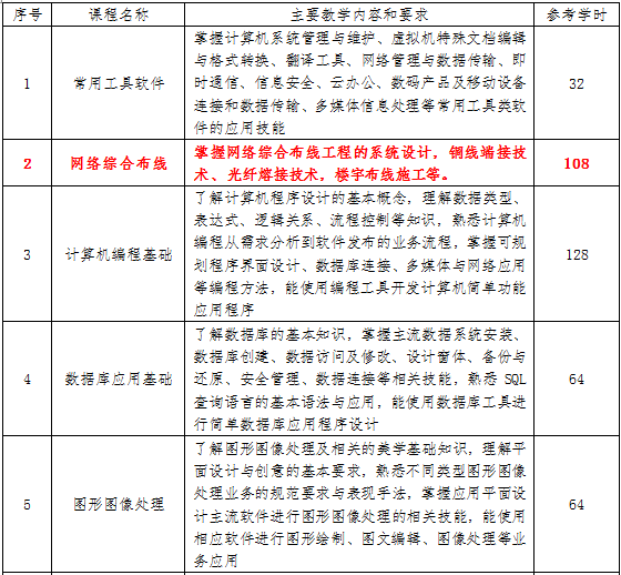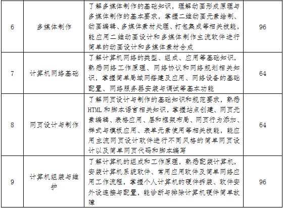 各学校可以根据自己学校的教学要求灵活安排综合实训,建议以计算机应用的综合项目或采用企业真实工作项目等方式进行,也可以和学生技能证书考核要求结合进行。时间安排上可以结合课程的进度,安排在每个学期,也可以统一安排在第5学期。技能考证要在当地教育主管部门的统一要求下完成,证书要求以当地教育主管部门的统一要求为准,可以使国家相关部门(教育部、人力资源社会保障部、工业和信息化部等)的职业技能帧数,也可以是当地教育主管部门或行业协会统一认可的职业资格证书。