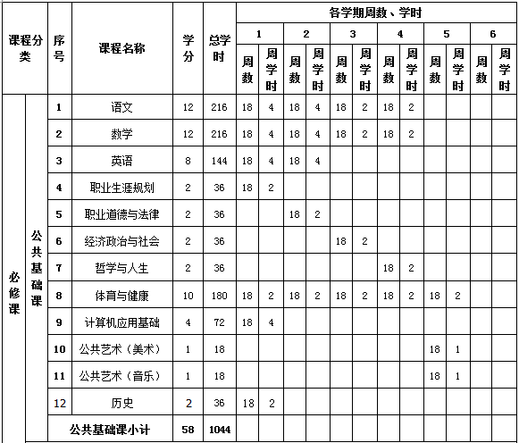 公共基础课包括德育课、文化课、体育与健康、公共艺术、历史,以及其自然学和人文科学类基础课。