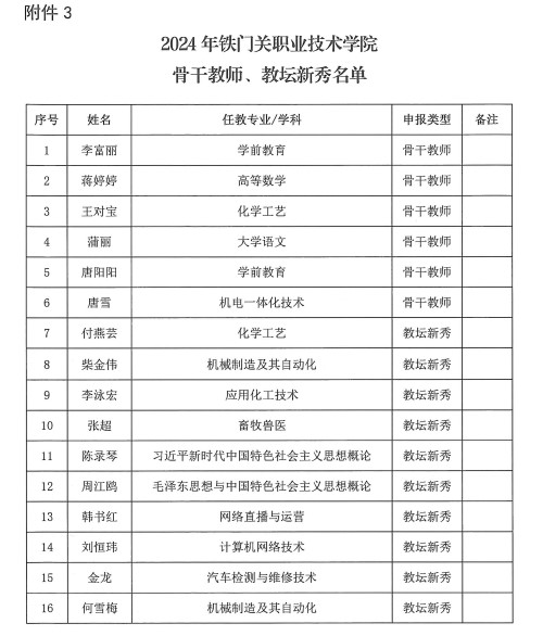 12月23日,根据师市教育局《关于公布2024年第二师铁门关市骨干教师、教坛新秀名单的通知》bat365在线中国官网登录入口共有16名教师获得骨干教师、教坛新秀荣誉称号,其中6人获得“骨干教师”荣誉称号,10人获得“教坛新秀”荣誉称号。具体名单如下: