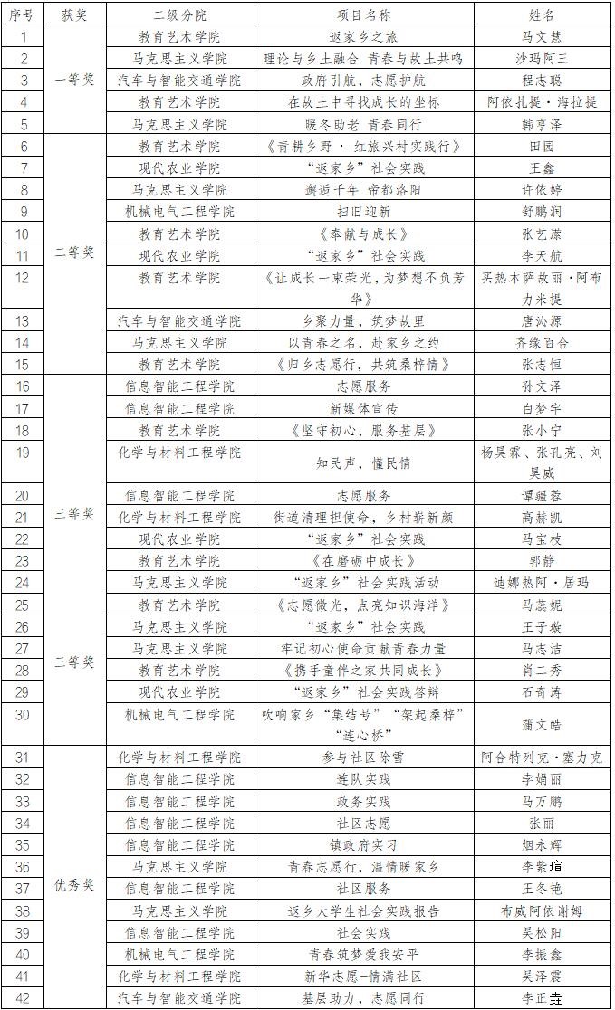 经严格评审,最终42个优秀项目脱颖而出。其中,教育艺术学院马文慧《返家乡之旅》等5个项目获得一等奖;现代农业学院王鑫《“返家乡”社会实践》等10各项目获得二等奖;信息智能工程学院孙文泽《志愿服务》等15个项目获得三等奖;化学与材料工程学院阿合特列克·塞力克《参与社区除雪》等12个项目获得优秀奖。获奖项目覆盖乡村振兴、志愿服务、文化传承等多个领域,充分展现青年学子扎根家乡、服务社会的创新活力。