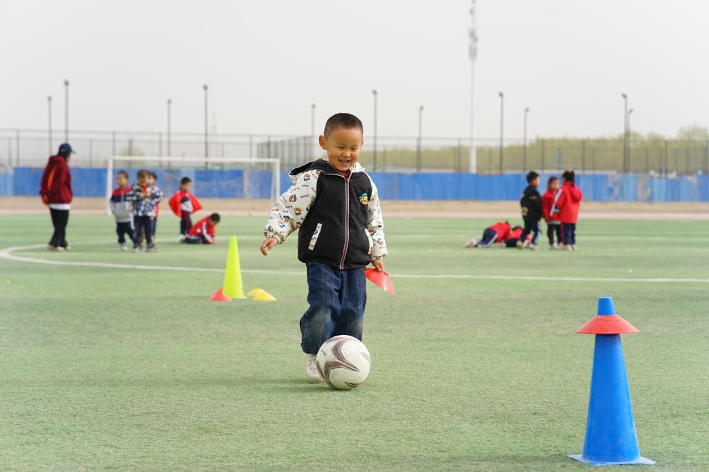 在分组教学中,23名萌娃分成4组,在大学生“教练”的指导下,学习了脚内侧带球、轻推传球等基础技巧。孩子们认真模仿动作,虽略显笨拙却充满热情。在之后的“足球接力赛”和“射门大赛”中,萌娃们带球绕桩、奋力射门,充分展现学习成果,在团队协作中尽显童真与活力。获胜小组的孩子们高举小足球挂件奖品,脸上洋溢着自豪的笑容。