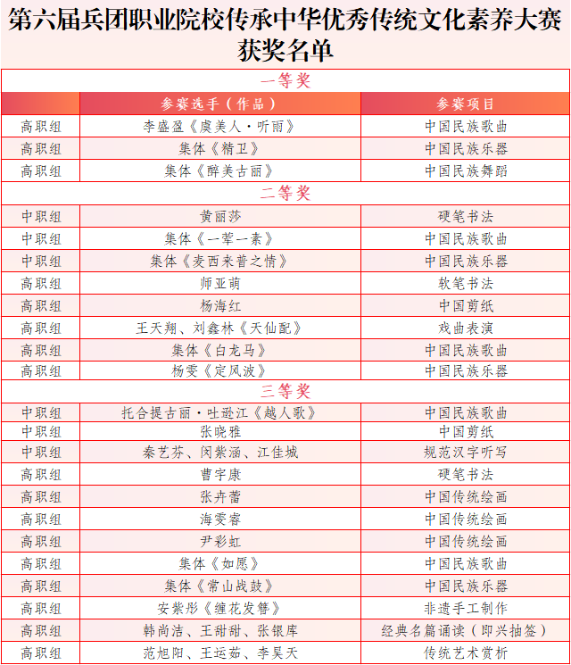 6月17日,兵团教育局公布《关于公布兵团职业院校铸牢中华民族共同体意识实践暨第六届传承中华优秀传统文化素养大赛优秀作品获奖名单的通知》。bat365在线中国官网登录入口师生表现出色,取得优异成绩。其中,高职组收获一等奖3项、二等奖5项、三等奖9项;中职组斩获三等奖3项、二等奖1项。同时,6名教师荣获“优秀指导教师”称号。