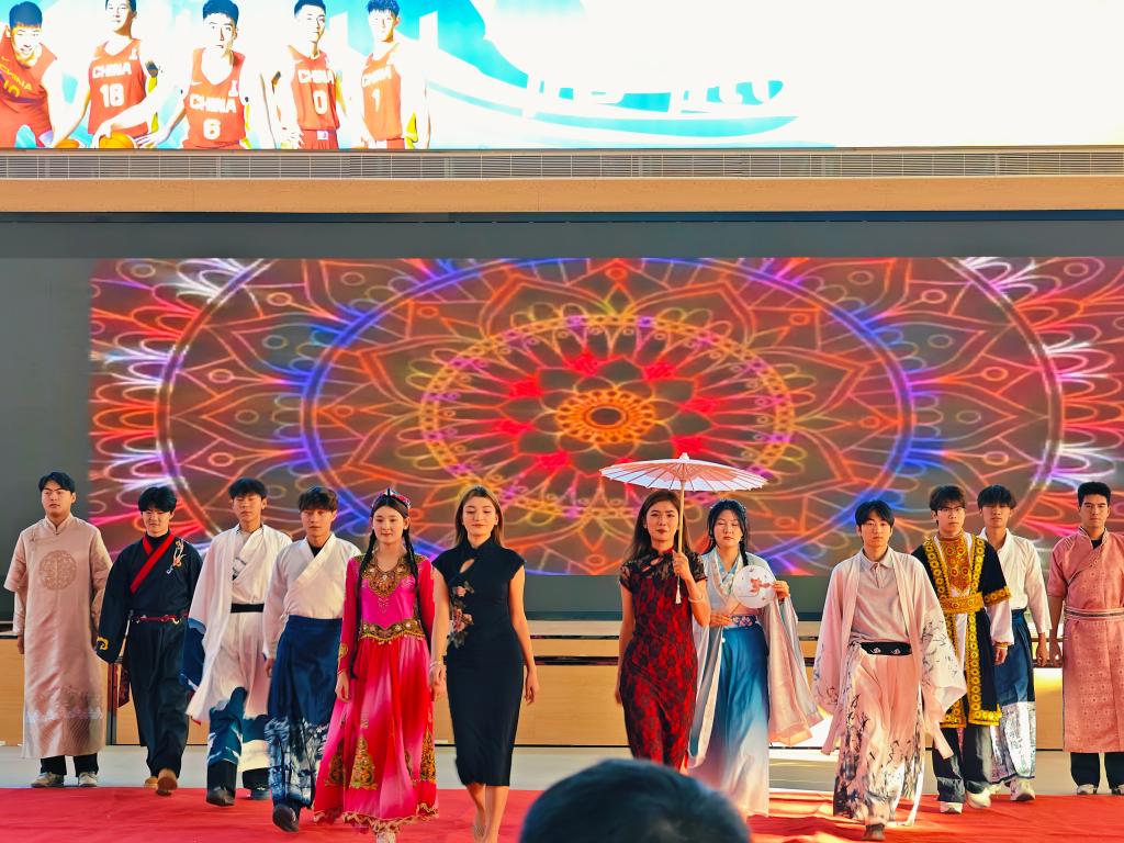 服装走秀《韶华映画·校园民族时装秀》将民族服饰与现代设计碰撞融合,武术《丝路武风》以刚劲动作诠释丝路精神的坚韧包容,歌曲《有我》《无名的人》传递青年担当与平凡力量,舞蹈《美丽中国》描绘祖国山河之美,最终全场师生合唱《歌唱祖国》,用歌声凝聚家国情怀,整场汇演在传统与现代的交织中彰显文化自信。
