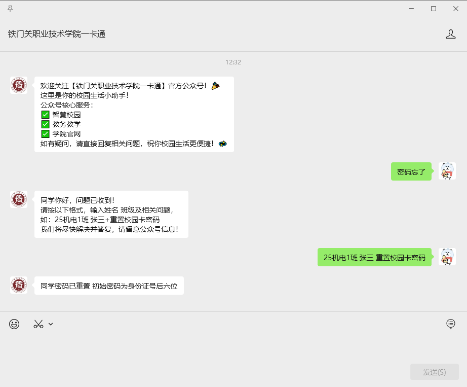 一卡通广泛用于餐饮、门禁等校园场景。以往师生咨询密码修改、挂失解挂、充值未到账等问题时,多需现场办理或群内询问,存在不便。学院信息管理中心现推出公众号自助咨询服务,采用“线上留言+专人对接”模式。师生关注公众号后,可按“姓名+班级+具体事项”格式留言。建议留言时详细描述问题场景和时间等关键信息。