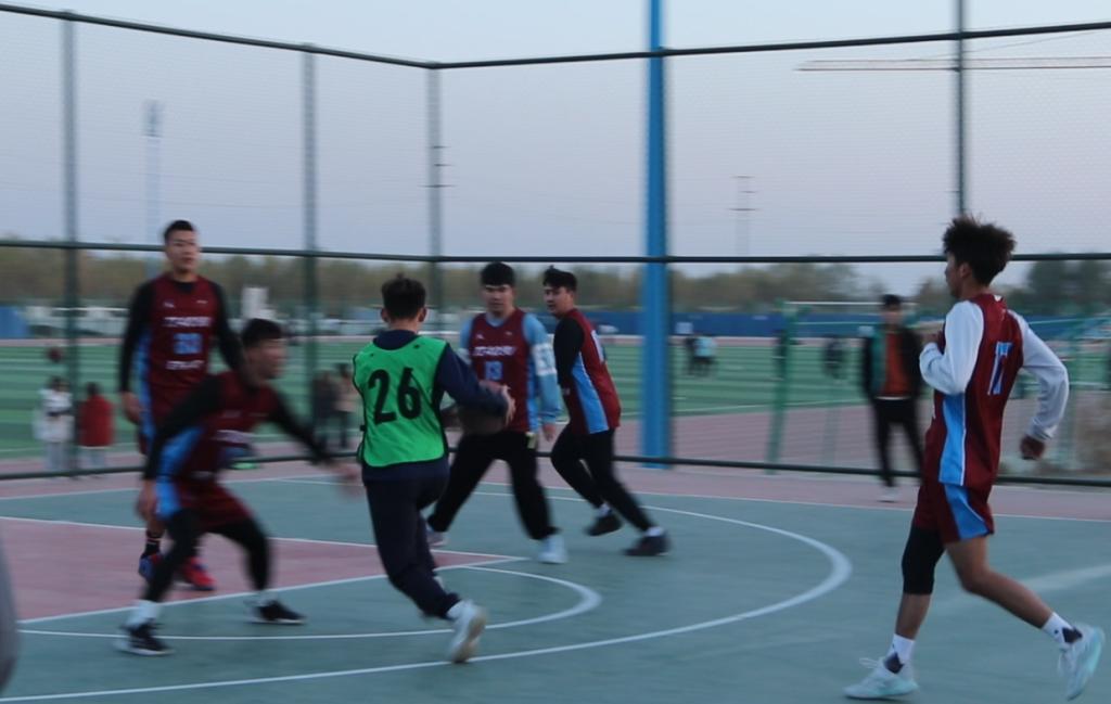 开赛前,球场周围早早地围满了前来观赛的同学,参加比赛的球员们热情高涨,随着比赛的开始,现场呐喊加油声此起彼伏;比赛也越来越激烈,各种样式的篮球技巧和精准的投篮为球队贡献了一分又一分,每个队员都积极跑位,为队友作掩护,还时不时有精妙的传球、漂亮的配合和精彩的上篮,紧张激烈,扣人心弦。