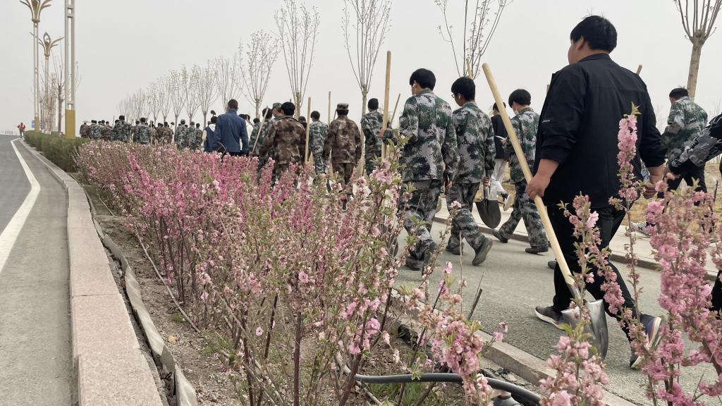 植树现场一片繁忙,百人分工、两两一组,铲土造坑、育苗新生、分工明确,共建绿色城市。