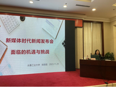 我院副院长管媛辉副教授和网络与新媒体系教师张鹏霞受邀为此次培训开展专题讲座。管媛辉老师以《新闻发言人媒体应对能力提升》为题,从突发事件中新闻传播的功能、紧急情况下新闻传播媒体的策略和应急新闻下新闻传播机制的构建这三个方面进行了详细的讲解。张鹏霞老师做了题为《新媒体时代新闻发布会面临的机遇与挑战》的专题讲座,从机遇和挑战并存的视角重点讲解了新媒体技术语境下新闻发布工作呈现的特点,并立足于吉林省新闻发布实践工作提出相应建议。讲座内容充实,生动精彩,为相关部门的新闻发布工作赋能增效。