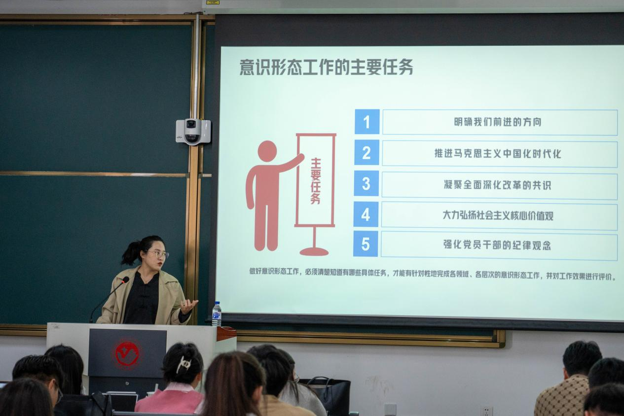 鲍永新老师主要以新环境下高校意识形态的发展脉络为主线,从高校意识形态的形成原因和发展走向两个维度展开,并从什么是意识形态、意识形态的特点、意识形态在新闻传播中的重要作用三个层面分析,明确了意识形态工作在新闻采编中的主要任务——一是明确前进方向和新闻正确导向;二是推进马克思主义中国化的时代进程;三是凝聚全面深化改革;四是大力弘扬社会主义核心价值观。鲍永新老师强调了新闻采编工作要时刻谨记意识形态至上原则,并且通过讲述典型新闻理论和事实案例对高校意识形态特点进行拆解分析。同时,鲍永新老师也对高校突发性新闻的积极处理给予了在方法论层面的指导。