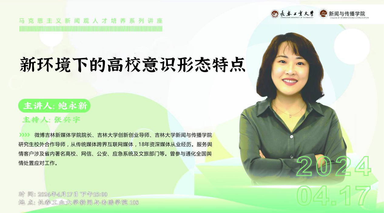 新闻网讯(通讯员 张兴宇)为进一步推动我院马克思主义新闻观课程体系建设,提升我院学生新闻写作水平,加强学生在新闻作品创作中的思想意识,掌握新闻行业新闻写作动态,构建马克思主义新闻观理论课程体系的实践性,2024年4月17日下午15时,开云kaiyun官网邀请新浪吉林运营总监鲍永新老师开展了题为《新环境下的高校意识形态特点探析》的专题讲座。该讲座由我院广播电视编导专业教师张兴宇主持,我院2023级广播电视专业、新闻与传播专业研究生参加了此次讲座。