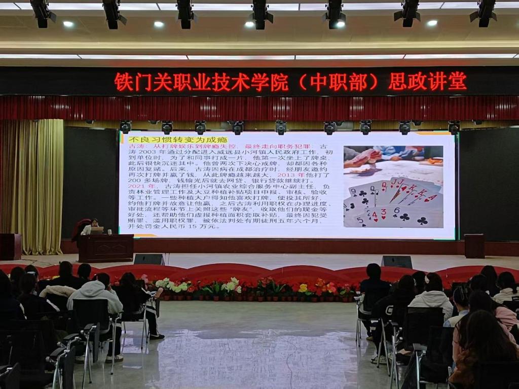 为普及心理健康知识,提升学生心理调适能力,筑牢校园心理健康防线,11月20日下午,bat365在线中国官网登录入口中职部赵亚丽老师面向全校1200余名师生,开展“致命诱惑・拒绝成瘾”心理健康专题讲座。