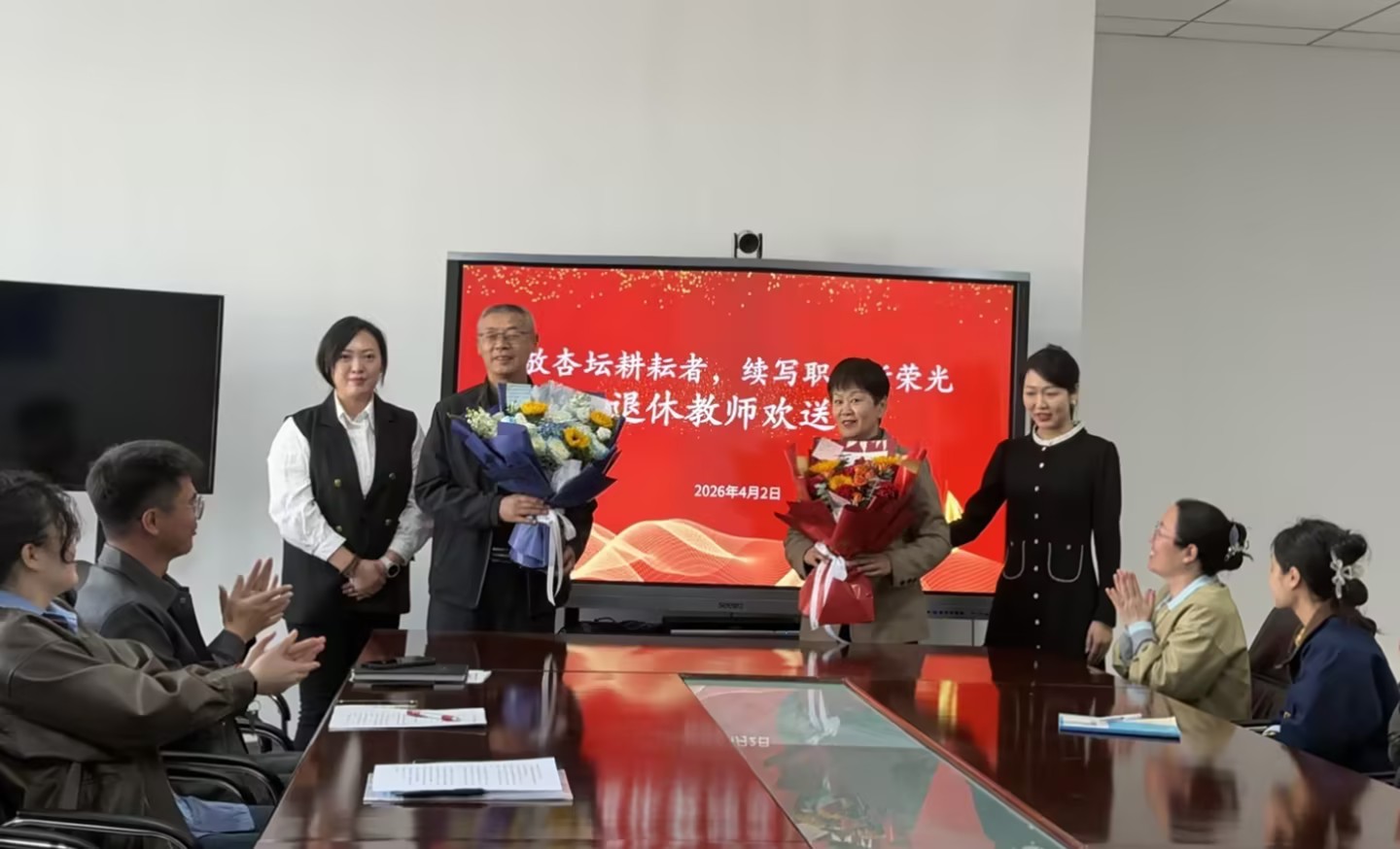 随后,教师代表为两位退休教师献花,学院领导为两位老师赠送纪念品并简要致辞,祝愿他们退休生活幸福安康、充实愉悦。