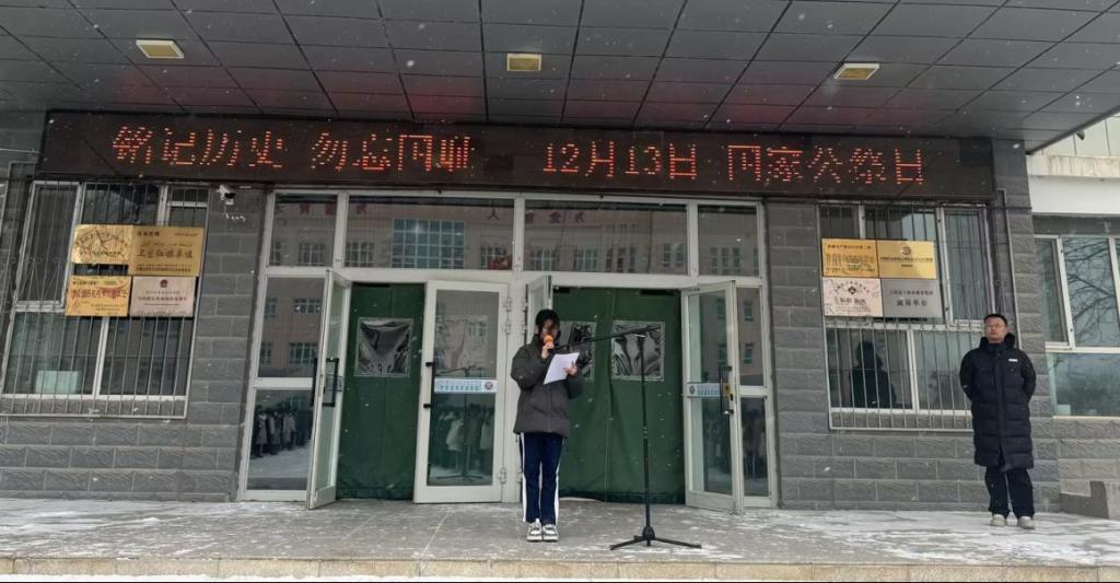默哀结束后,学生代表王朱语墨发言,她呼吁同学们要铭记历史,勿忘国耻,也要珍惜当下来之不易的和平生活。同时要有责任和担当,磨练心性,锻炼技能,为国家的繁荣富强贡献自己的力量。告诫同学们要从历史中汲取力量,增强民族自信心和自豪感,作为新时代的青年,我们不仅要铭记历史,更要以史为鉴,开创未来。