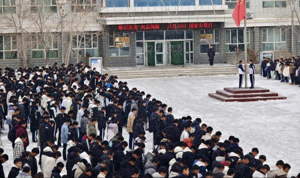 活动现场,师生们肃立在国旗杆下,伴随着庄严的国歌,国旗升起,随后缓缓降下半旗,全体默哀,表达对历史的尊重和对和平的渴望。
