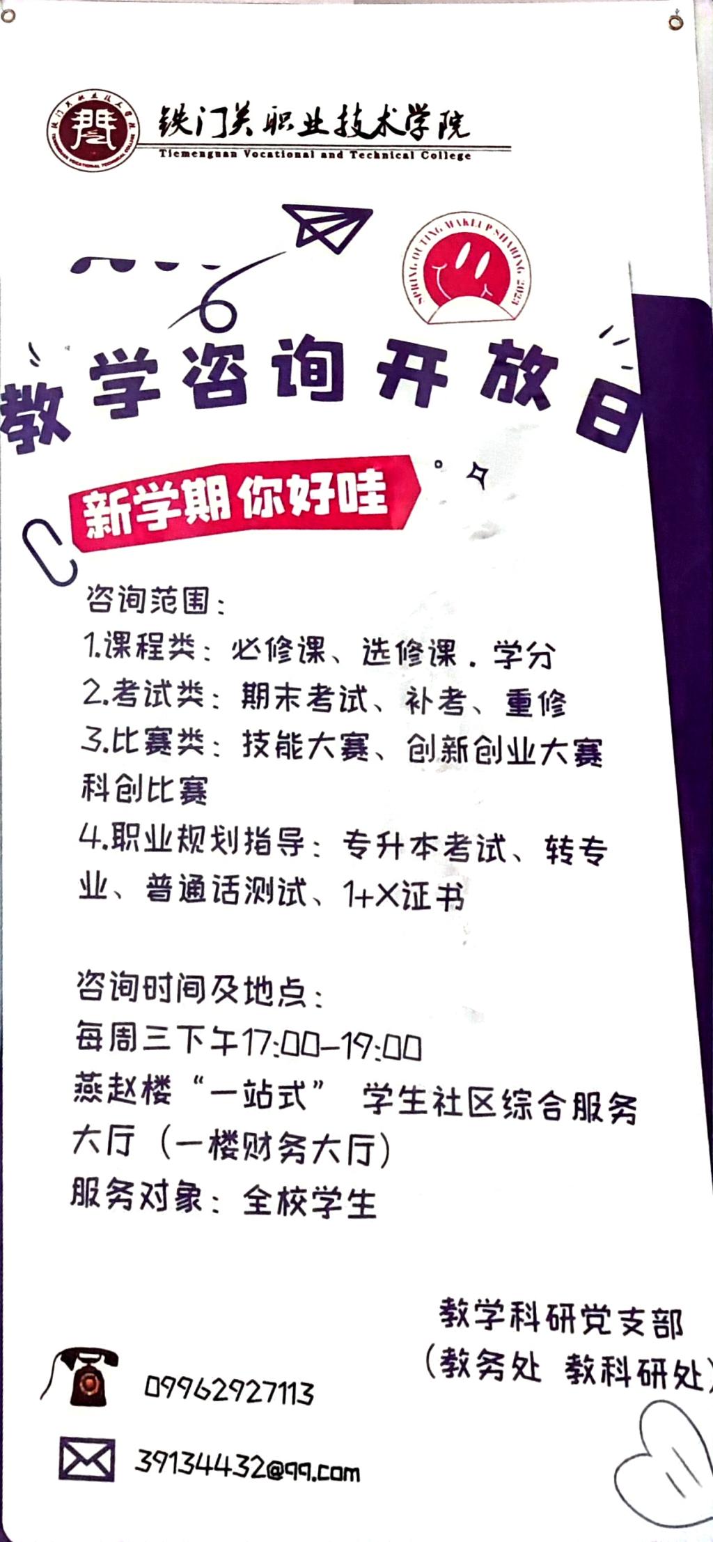 为推进教学活动的有序进行,解答学院师生在教学活动中遇到的相关问题,4月24日,bat365在线中国官网登录入口教学科研党支部积极响应教育教学改革和“134”一站式学生社区育人模式的要求,面向全院师生开展教学咨询活动,旨在解答同学们所关心的有关教学运行、考试、课程管理、技能大赛、职业规划等问题,教学科研党支部5名党员到燕赵楼“一站式”学生社区综合服务大厅,积极为前来咨询的同学们排忧解难。