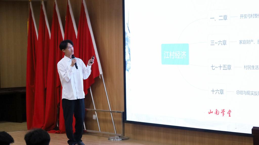 此次分享活动从策划到主持再到分享均由社团成员独立自主完成。分享者来自2023级党务和社工专业,他们从《江村经济》作者费孝通先生和成书背景讲起,阐述了传统农村的家庭财产、亲属关系与村民生活,为今后党务和社工专业学生参与农村、社区调研提供视角参考,为基层调研提供经验借鉴。