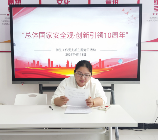 随后,党员代表蒲国秀同志就“总体国家安全观创新引领十周年”主题进行交流发言。她提到身为教育战线的一员,要肩负培养未来国家栋梁的重大使命,要明确国家安全不仅仅是军事安全,还包括政治安全、经济安全、信息安全、文化安全、校园安全等多个方面。作为一名辅导员,首先要强化学生的国家安全意识;其次,要引导学生积极参与维护国家安全的行动;最后,要培养学生的爱国主义情怀,让他们树立为国家繁荣富强而努力奋斗的信念。