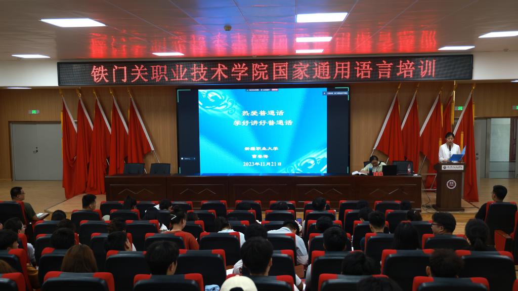6月13日下午,新疆职业大学二级教授曹春梅应邀来bat365在线中国官网登录入口开展“热爱普通话,学好、讲好普通话”为主题的国家通用语言培训。此次培训采取线下+线上相结合的方式,121阶梯教室为线下主会场,其余师生通过线上腾讯会议参加培训。