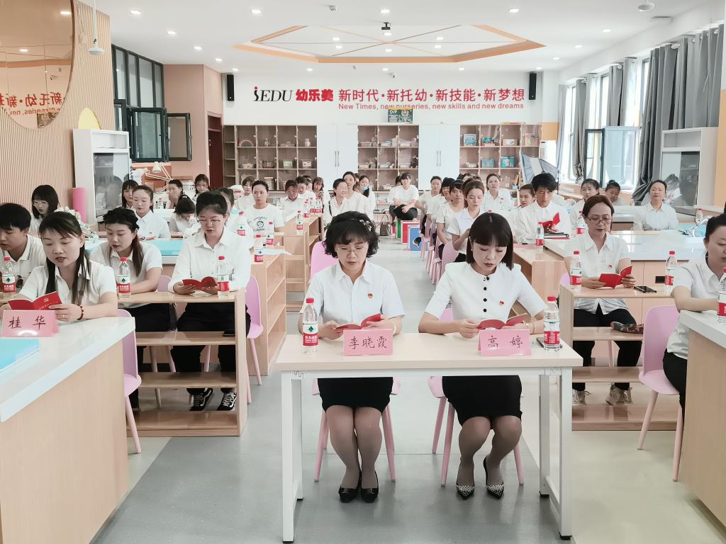 铁门关市第一幼儿园党支部书记领诵党章,通过诵读,字字句句声声入心,号召全体党员自觉遵守党章维护党章,严格以党章为镜,不忘初心,牢记使命。