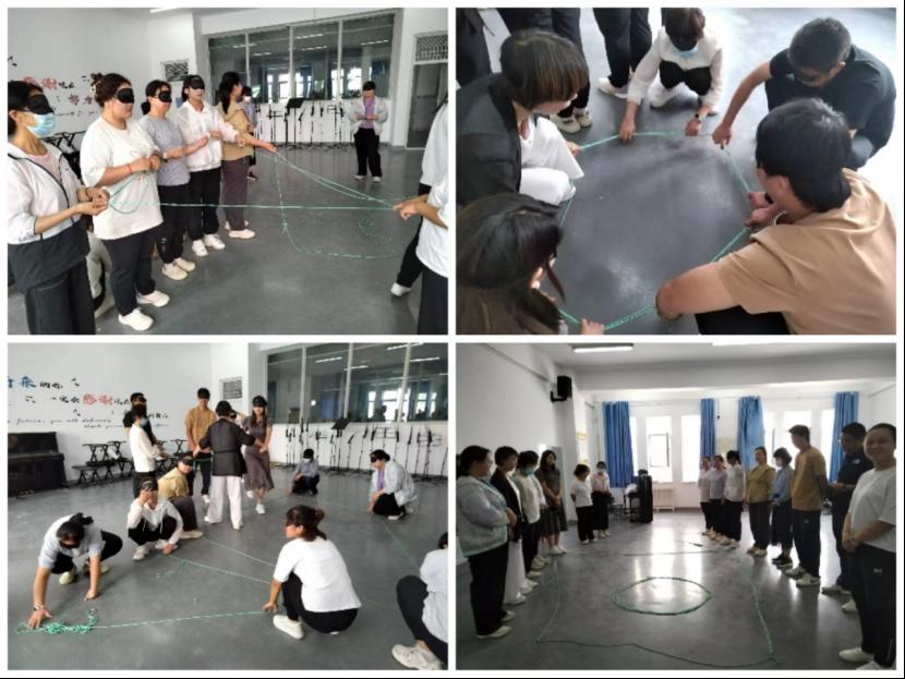“盲人搭房子”是一个难度较高的游戏,教师们在看不见、说不了的情况下,自主完成了平均分组、用绳子拉出不同几何图形,最后三组合作搭建出“房子”工程。不仅让每个人在自我摸索中寻找到自己的位置,表现出自己的价值,更是锻炼了大家彼此理解、彼此协同、彼此配合、不达目的决不罢休的团队凝聚力。