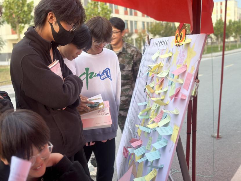 活动现场以展板+留言的形式向学院师生展示精神健康和预防保护自己心理健康精神的知识,展板前,来往的学生纷纷在便利贴上写上自己的观点看法与大家分享。