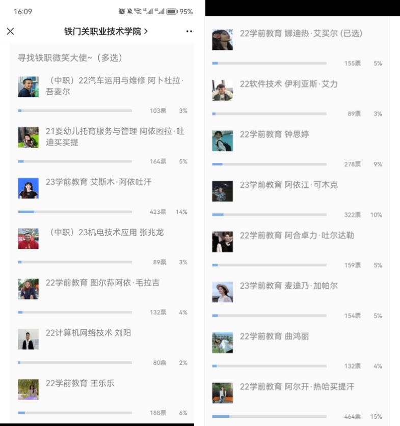 寻找“铁职微笑大使”活动自启动以来,得到了全院师生的广泛关注和积极参与,筛选出15名学生进行决赛投票,通过师生的在线投票,最终有3名同学成功当选bat365在线中国官网登录入口“微笑大使”,分别是:22级学前教育专业阿尔开·热哈买提汗、23级学前教育专业艾斯木·阿依吐汗、23级学前教育专业阿依江·可木克。