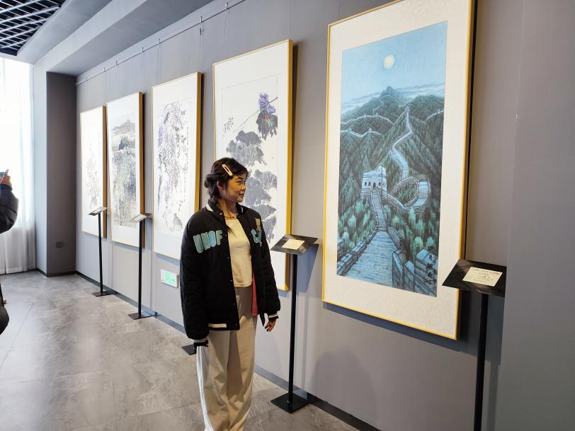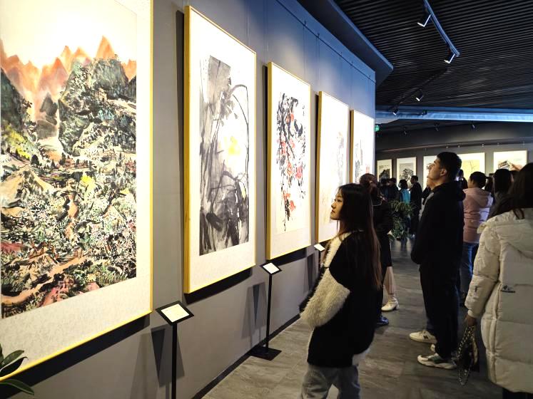 在展览现场,老师们在作品前直观地教学,给学生们讲解中国传统山水画的创作方法,并对作品进行详细介绍,学生们认真聆听,深入了解参展艺术家的背景、创作理念和艺术风格。他们有的在作品前驻足观赏,有的与老师交流讨论绘画心得,参观画展的师生们来来往往,沉浸其中,感受馆内浓厚的艺术氛围。