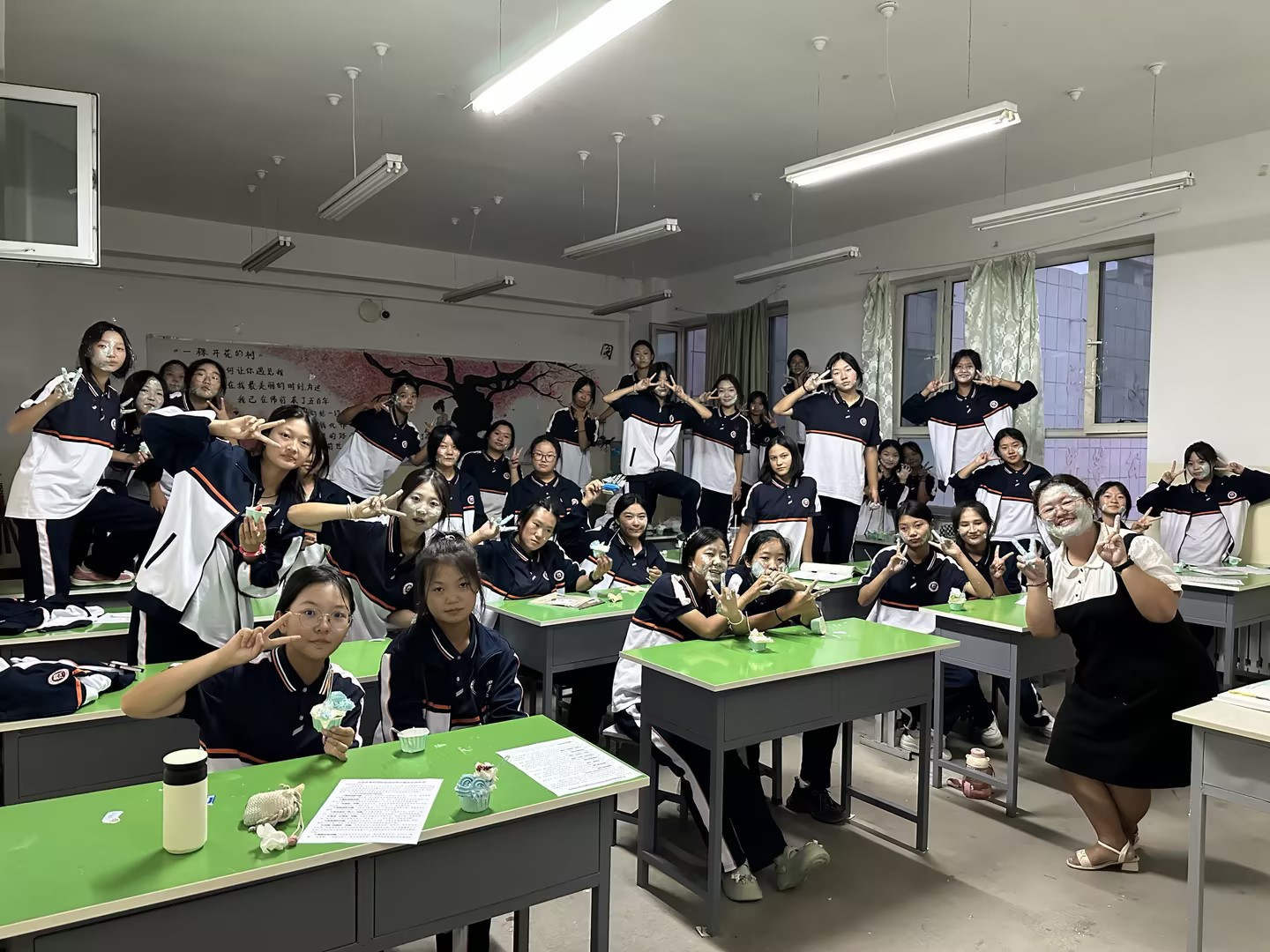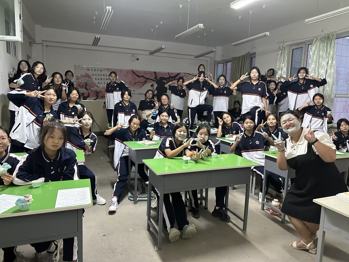 “祝你生日快乐,祝你生日快乐……”伴随着轻快的生日歌,36个纸杯蛋糕在同学们手中传递,36张甜甜的笑脸写满了3位任课老师诚挚美好的祝福,愉快的氛围感染着在场的每一个人,大家一起欢呼,把象征美好和祝福的奶油抹在同学的脸上,分享着浓浓的喜悦。
