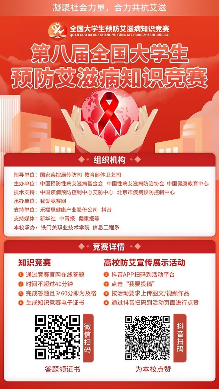 为贯彻落实《艾滋病防治条例》,宣传普及艾滋病防治知识,为进一步加强学生对艾滋病的认识和了解,增强自我保护意识,11月18日至30日,bat365在线中国官网登录入口信息工程系组织全体学生通过线上线下相结合的方式,参加了第八届全国大学生预防艾滋病知识竞赛活动。