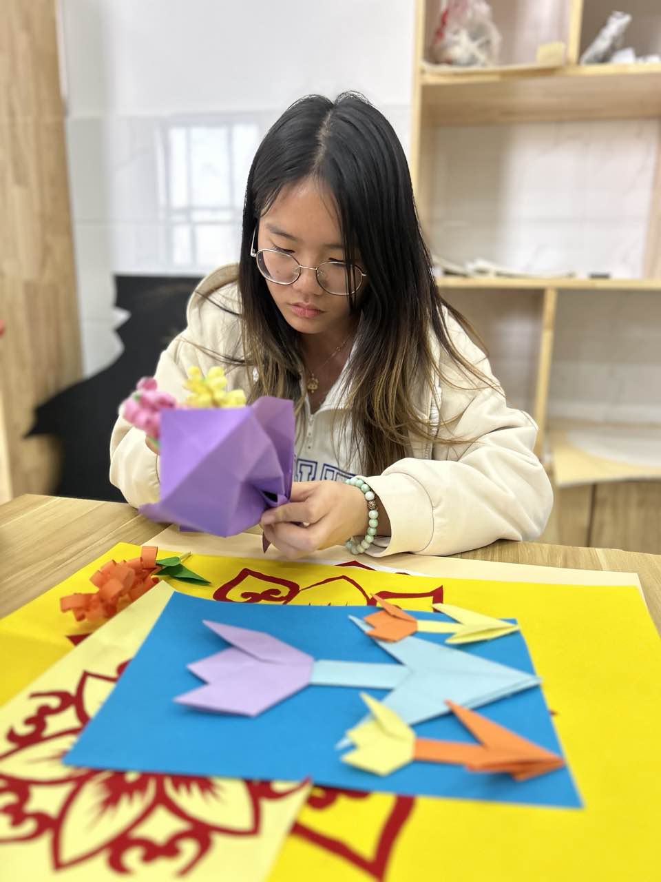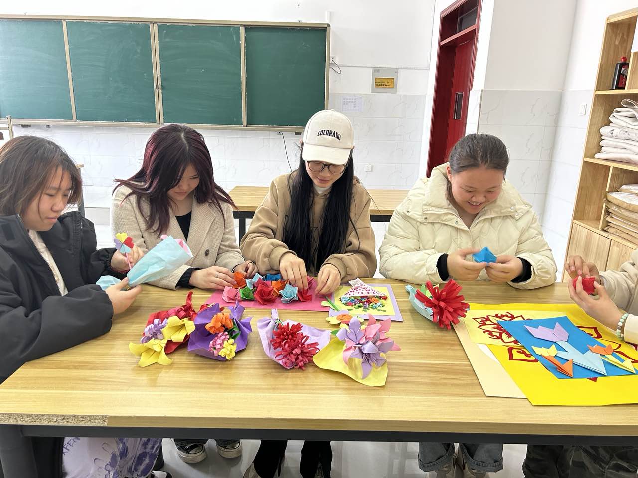 该系学生充分发挥想象力和创造力,用美术技能课上所学的知识,利用课余时间将彩纸通过折叠、裁剪、粘贴等步骤,制作成花朵和枝干的形状,一张张彩纸在她们手中摇身一变为一束束栩栩如生的花朵。