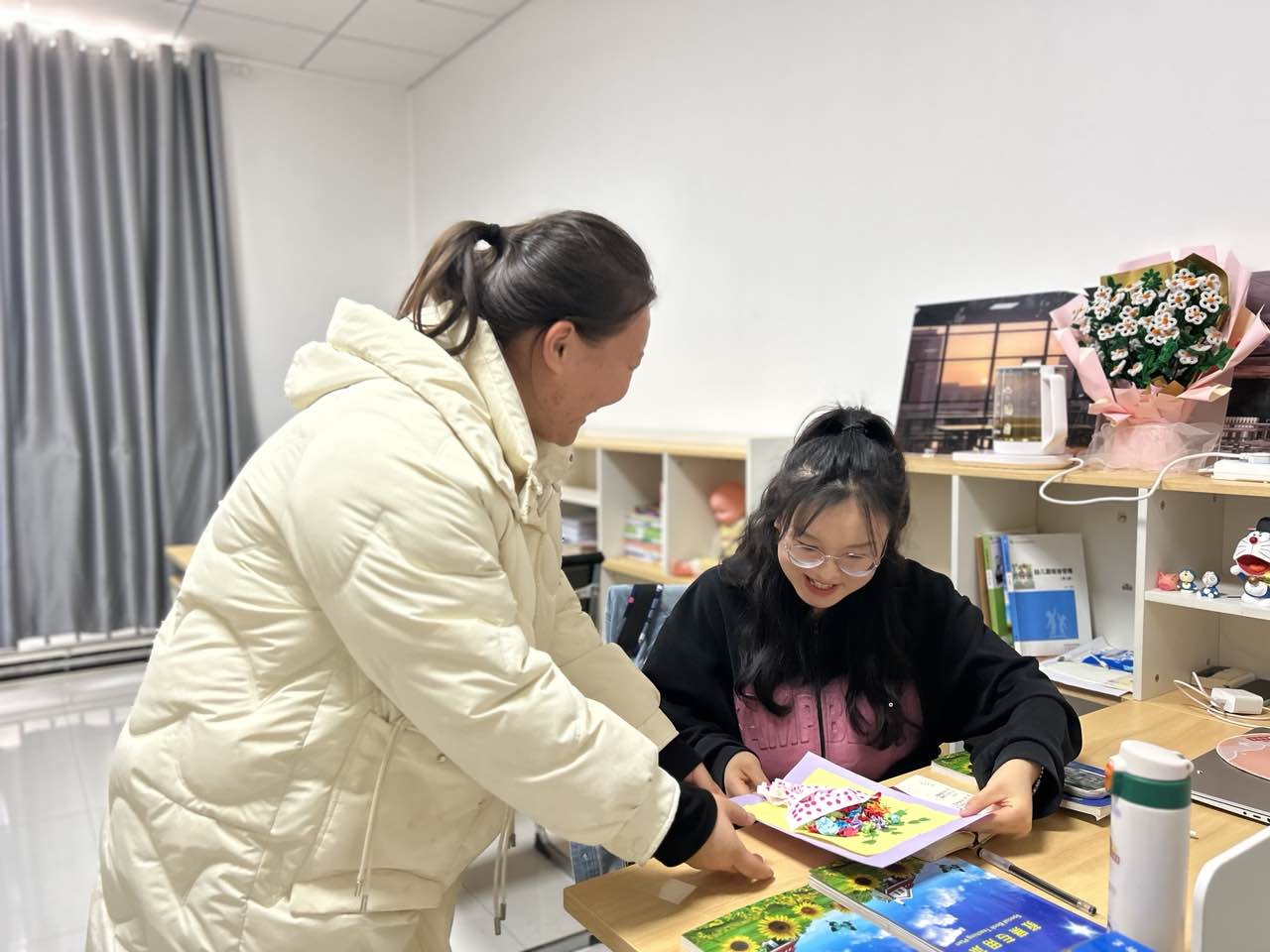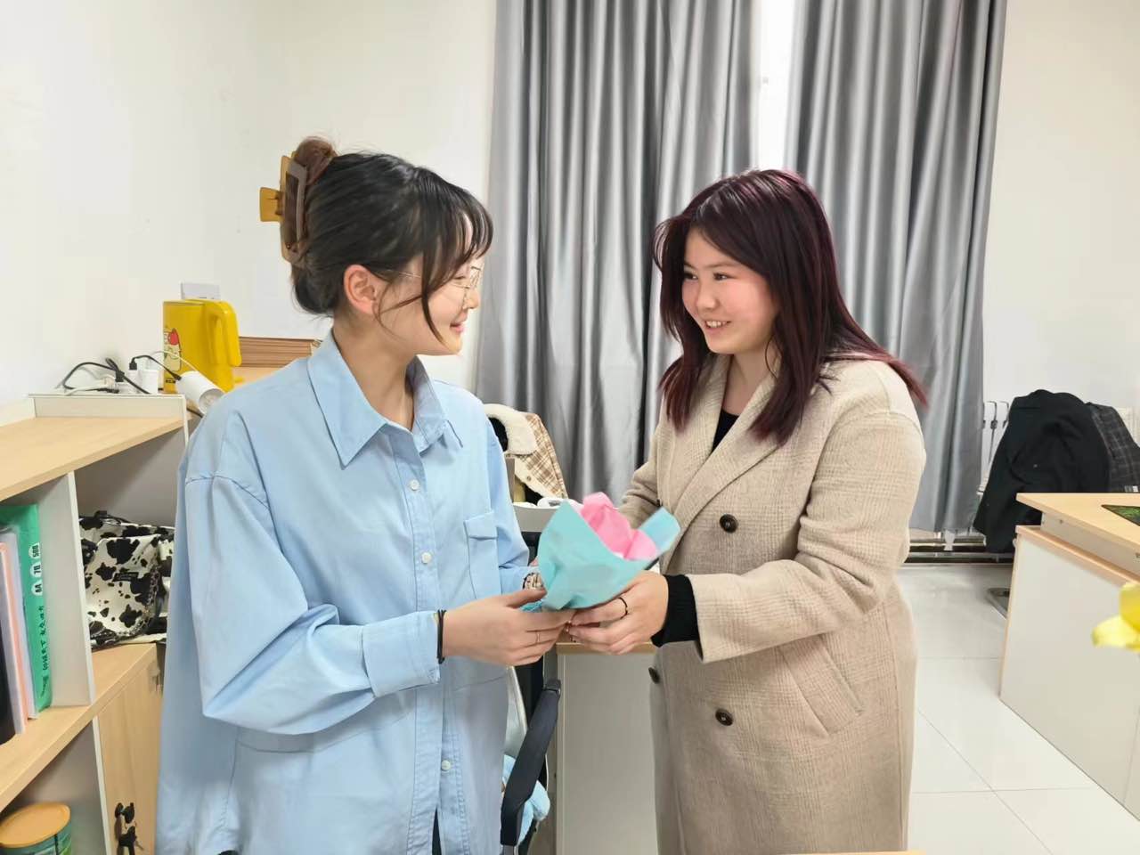 节日当天,学生们将亲手制作的花束献给办公室正在工作中的女老师们,表达对老师们的敬爱与感激之情,收到花束的老师们脸上洋溢着幸福的笑容。