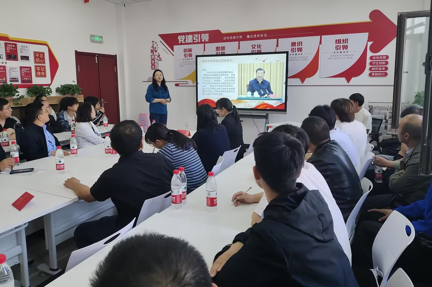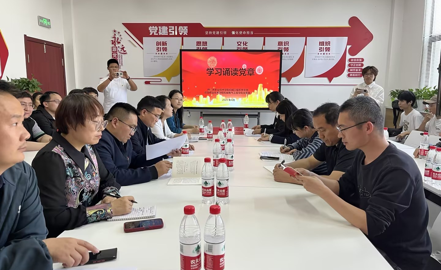 随后一行人进入学院3号楼星火社区党员活动室,学院机械工程系党支部书记何莲梅同志和巴音郭楞职业技术学院机械电气工程学院书记王庆红同志领学了重要文件。活动中全体党员佩戴党员徽章,着装整齐,庄严重温入党誓词,集体交纳党费,强化初心和使命。随后,支部党员刘启全同志诵读《中国共产党章程》第三章,宣传党的政治理论和方针政策,增强贯彻落实党的理论和路线方针政策的自觉性和坚定性。最后王庆红同志组织大家开展《铸牢中华民族共同体意识》专题党课,全体党员进一步明确了思想意识,端正了对意识形态的认识。