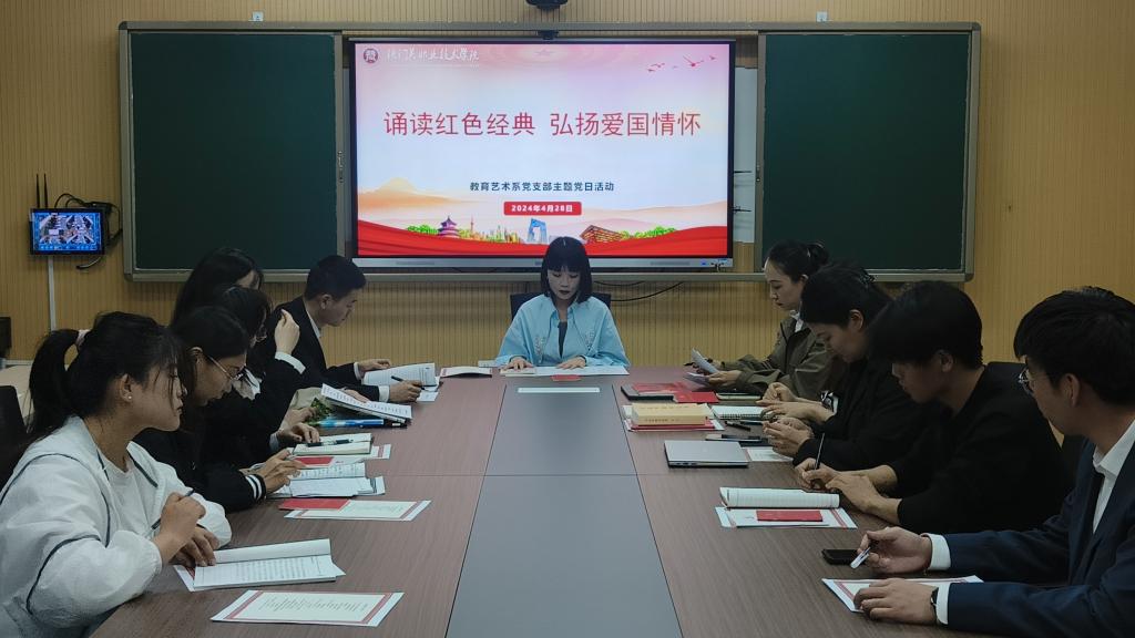 为进一步激发党员教师的爱国情怀,传承红色基因,bat365在线中国官网登录入口教育艺术系党支部于4月28日下午开展了“诵读红色经典·弘扬爱国情怀”主题党日活动。本次活动旨在加强该支部党员教师党性教育,提高党员的纪律意识,同时弘扬爱国主义精神,激发广大党员的爱国热情。