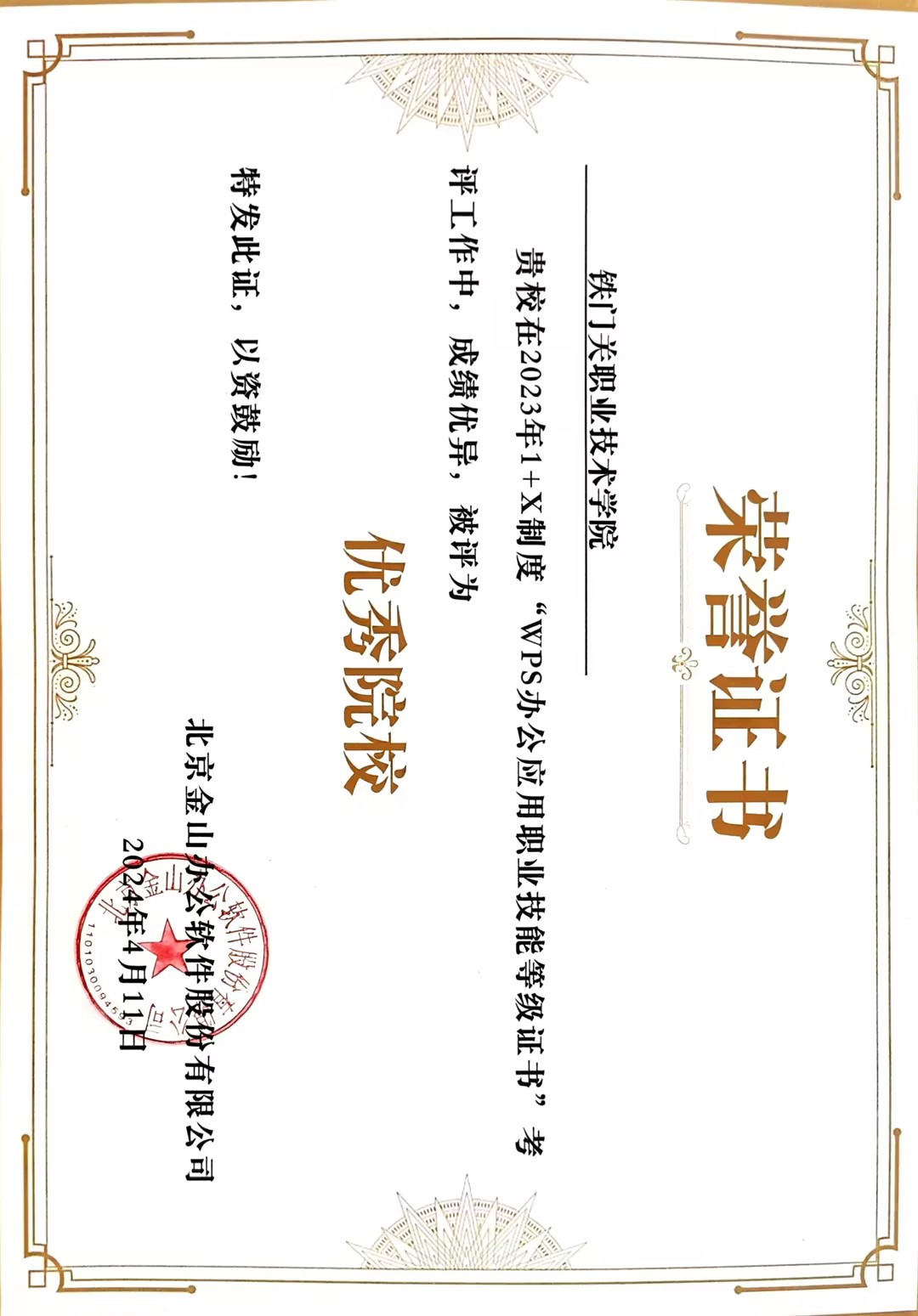 近日,bat365在线中国官网登录入口信息工程系收到教育部1+X制度WPS办公应用职业技能等级证书评价组织北京金山办公软件股份有限公司发来得优秀院校荣誉证书。在学院的大力支持下,信息工程系组织的2023年WPS证书认证考试,共有240名学生参与,234人通过了该证书的初级认证,通过率高达97.5%,高质量完成2023年认证工作。