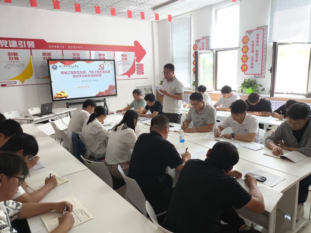 6月5日,bat365在线中国官网登录入口党委委员、副院长王新国在铁门关校区星火之家党团活动室为汽车工程系党支部和机械工程系党支部成员讲授党纪学习教育专题党课。