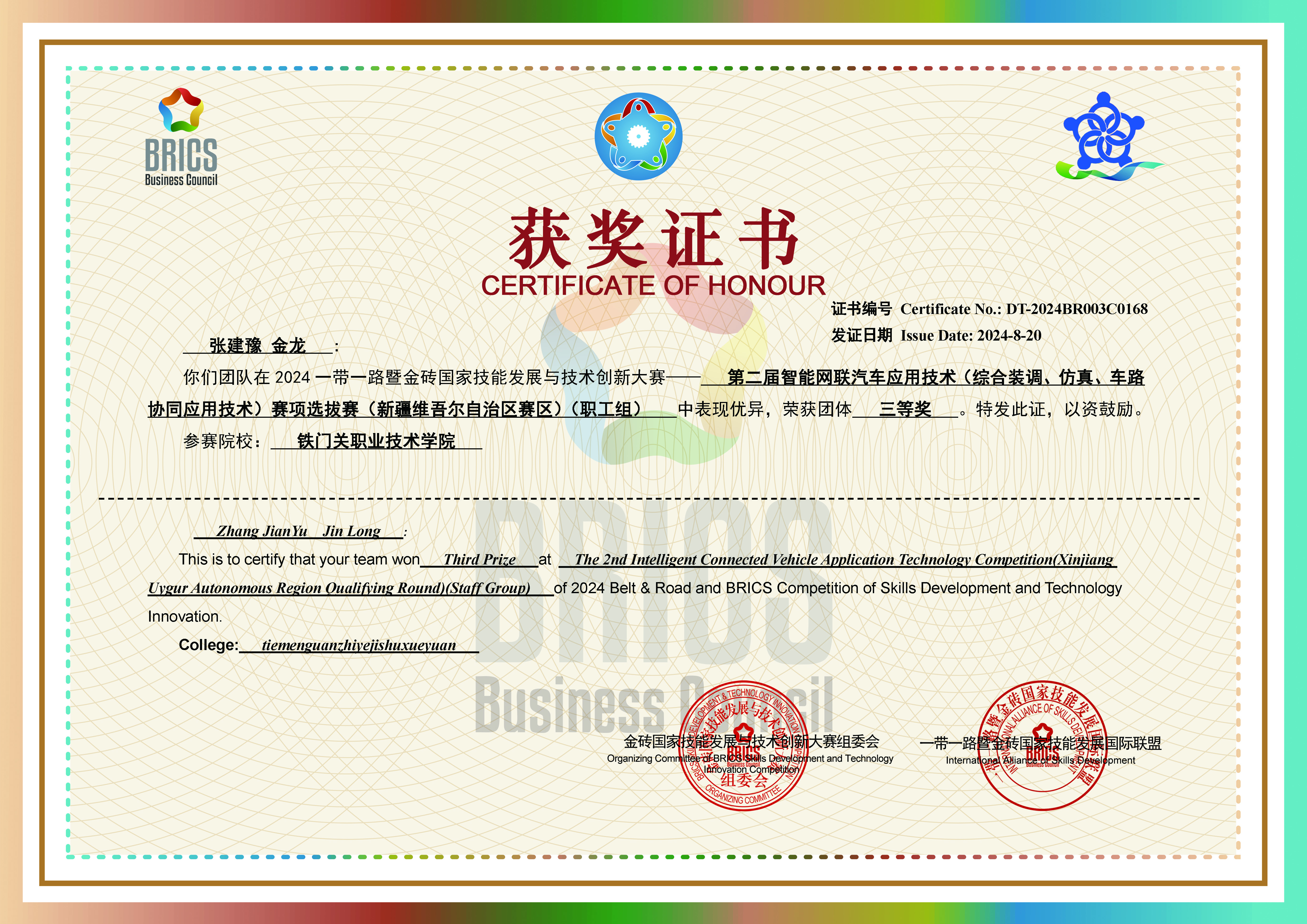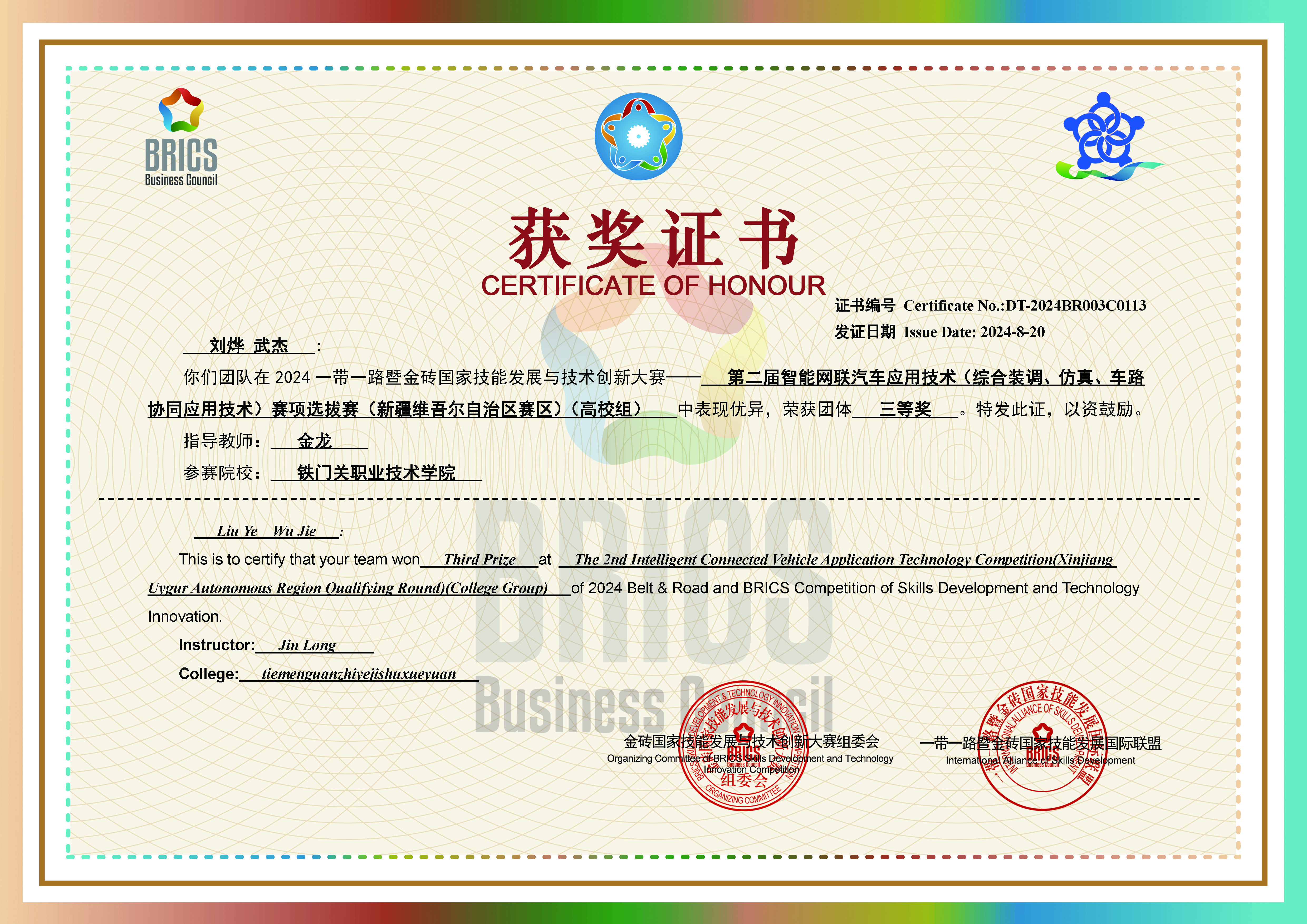8月28日,在刚刚结束的2024“一带一路”暨金砖国家技能发展与技术创新大赛智能网联汽车应用技术(综合装调、仿真、车路协同应用技术)赛项选拔赛新疆维吾尔自治区赛区中,bat365在线中国官网登录入口汽车与智能交通学院教师张建豫、金龙,学生刘烨、武杰凭借卓越的技艺、不懈的努力,获得职工组和学生组三等奖佳绩!
