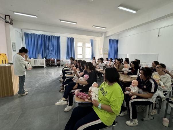 理论讲解后,学生们分组进行了实操练习。她们小心翼翼地与“宝宝”互动,学习如何正确更换尿布、喂奶等操作。每当“宝宝”发出哭声,现场总会响起一阵阵笑声,气氛十分活跃。