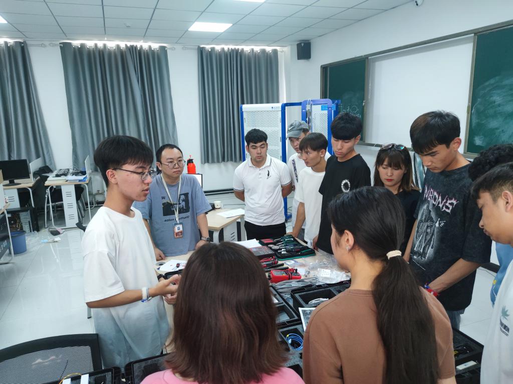 这次参观分为知识讲解和实际操作两个环节。系部专业课教师给大家讲解了在职业技能大赛中所用到的仪器设备以及如何模拟环境搭建物联网的智慧应用,随后,参加技能大赛训练的学生给大家展示了在应用版面上如何将仪器设备连接起来,同学们也跟随着拿起器件进行了实际操作的练习。