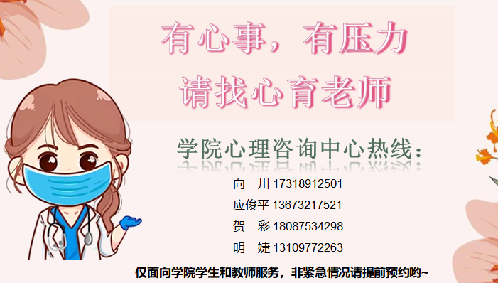 本学期以来,针对线上教学和疫情带来的压力,心理咨询服务中心开通了24小时心理咨询热线,对全院师生免费开放。同时,还增设了心理邮箱,随时随地为师生解决心理困惑、调节情绪状态。