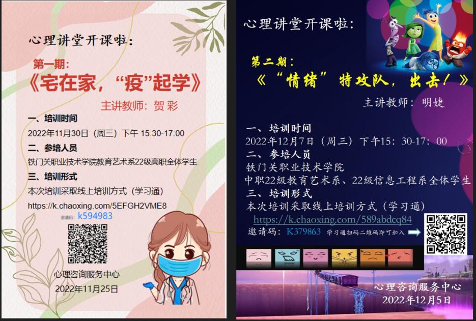 针对学院学生目前的心理特点及容易出现的心理问题,心理咨询服务中心推出系列专题讲座,目前已开展两期。第一期由贺彩老师主讲的《宅在家,“疫”起学》,用幽默诙谐的语言,针对学生网课适应问题、网课心理冲突给出了有效的解决途径;第二期由应俊平老师主讲的《“情绪”特攻队,出击!》,介绍了疫情期间学生会出现的不良情绪问题及其危害,结合生活细节给出了调节方案。