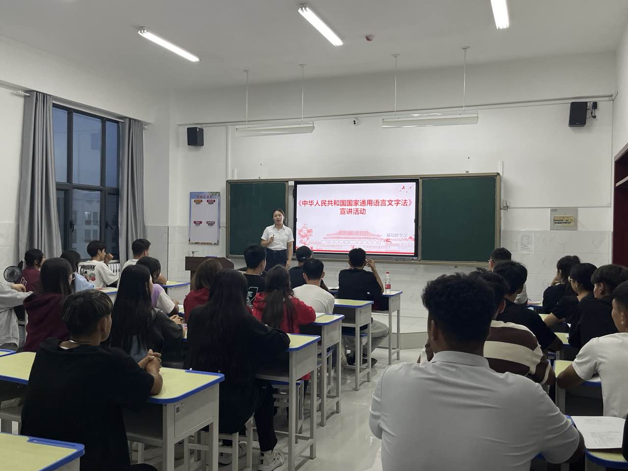 基础教学部教师根据学院安排,在各系各班进行语言文字法宣讲。信息工程系的国语课堂上,李玉洁老师通过多媒体设备,以图文并茂的方式向同学们解读了实施《中华人民共和国国家通用语言文字法》的目的、对象、原则和内容,引导同学们深入了解推广国家通用语言文字的重要作用和意义,提倡大家在日常生活中养成说普通话及使用规范汉字的习惯,为维护民族团结,铸牢中华民族共同体意识贡献力量。